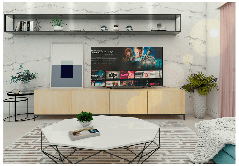 Na parede da tv, utilizamos um revestimento em mármore carrara, com veios bem definidos. "Mas pode usar revestimento porcelanato na parede da sala de estar?" Siiiim! Pode usar muito!