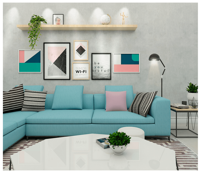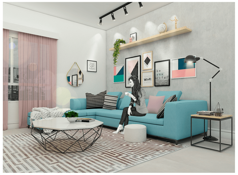 O foco de cor está no mega sofá, em tom de azul tiffany e nos detalhes da decoração, para acolher, alegrar e tornar a sala do jeitinho que gostamos, aconchegante!