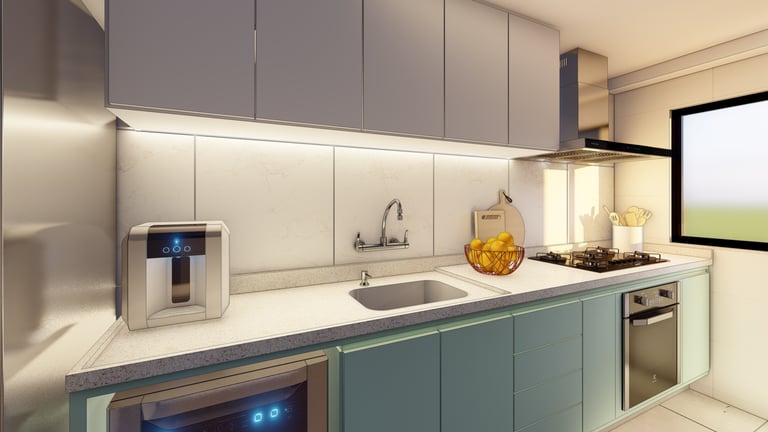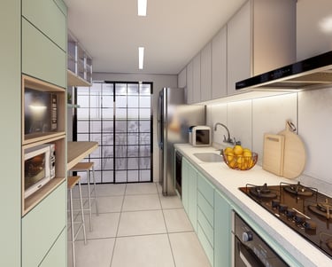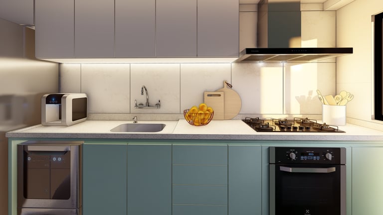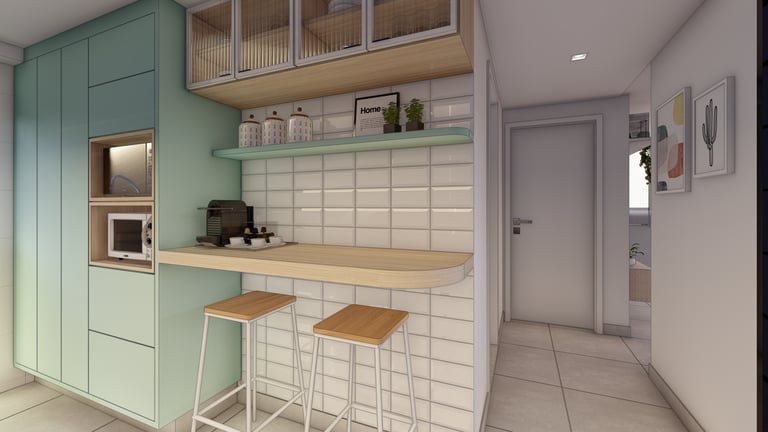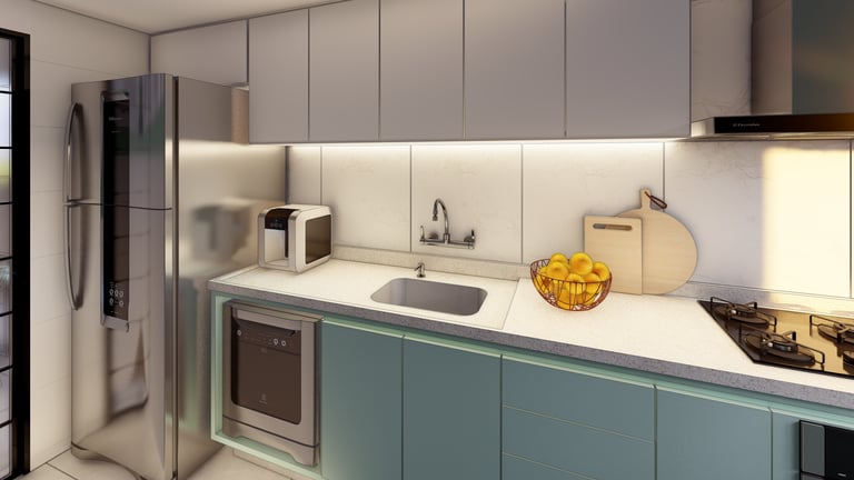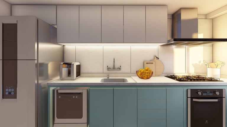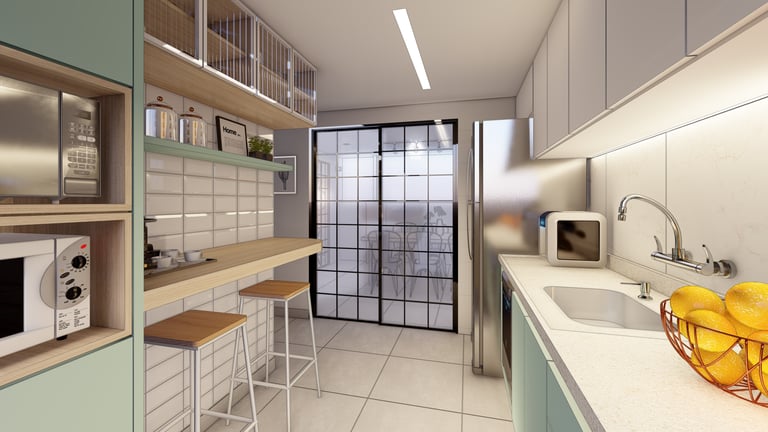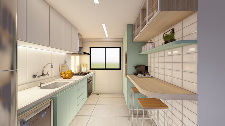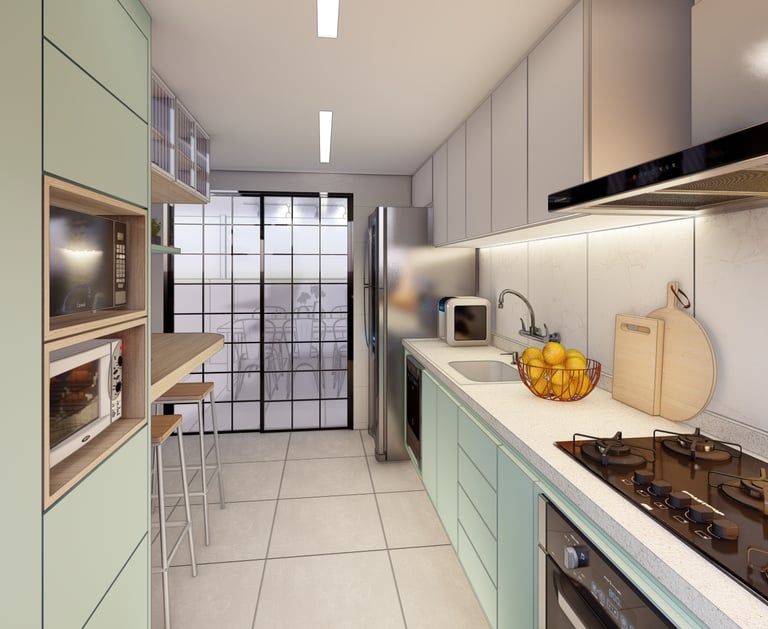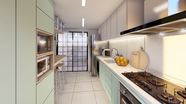 Na cozinha, optamos pela disposição linear dos principais equipamentos: geladeira, pia e fogão. Já na bancada paralela, aproveitamos para a criação de armário de piso ao teto, nicho para micro-ondas/forninho e bancada para refeições rápidas.