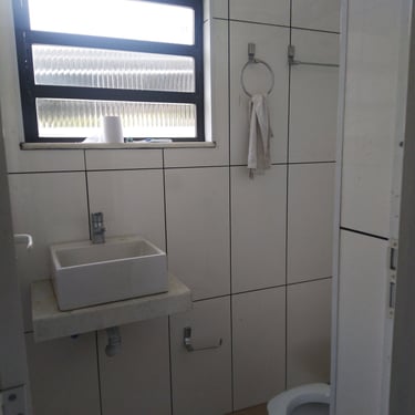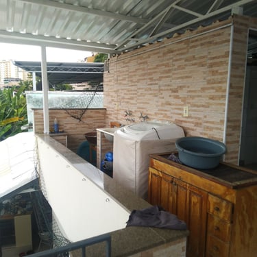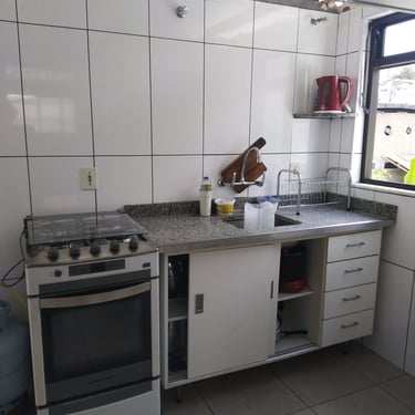Reformamos a cozinha, banheiro social, área de serviço, quarto e criamos uma sala de estar. O terraço tornou-se um quarto e sala independente.