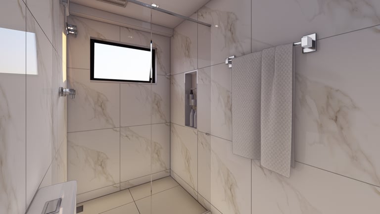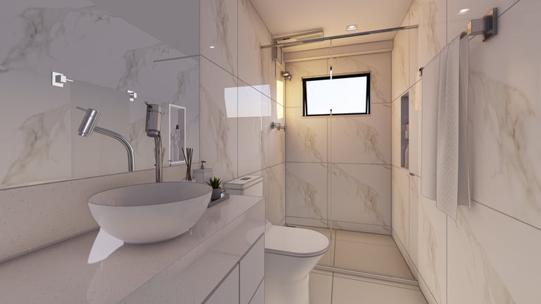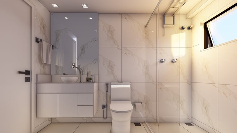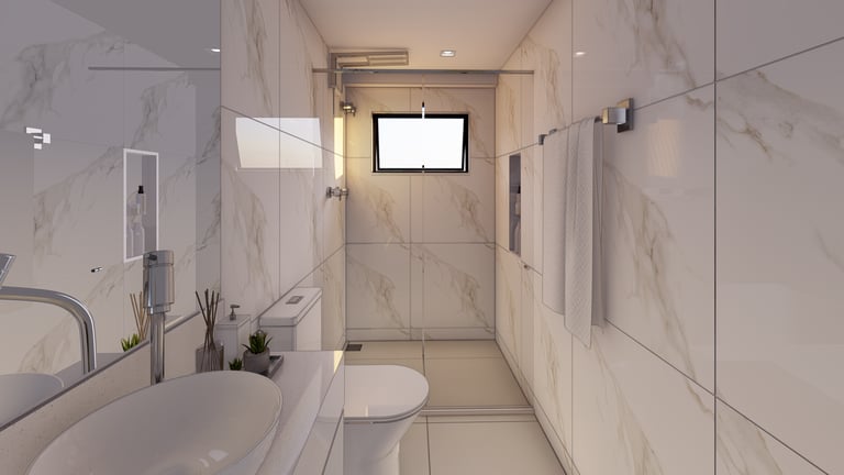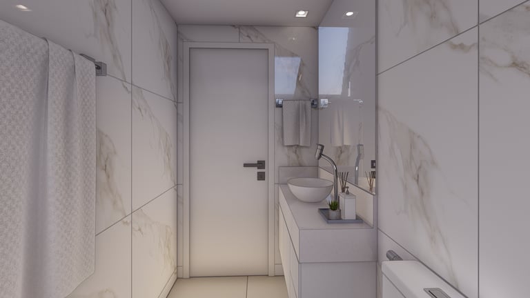 O banheiro é pequeno, porém extremamente funcional, com aproximadamente 3,55m², sendo 1,30m de largura. Almejando a claridade, especificamos revestimentos de piso e parede de tonalidade clara, o piso em porcelanato com textura de cimento queimado acetinado e as paredes em porcelanato branco marmorizado bem polido.