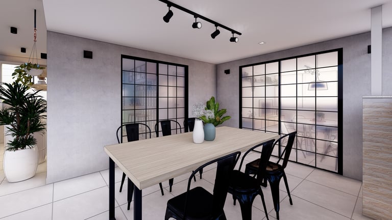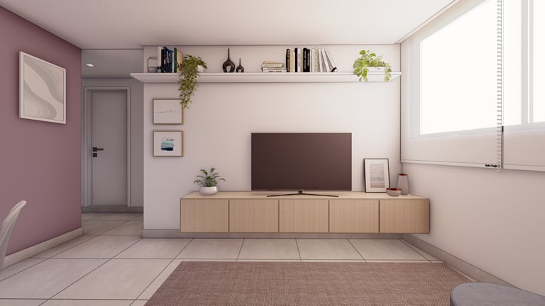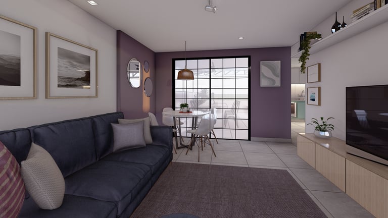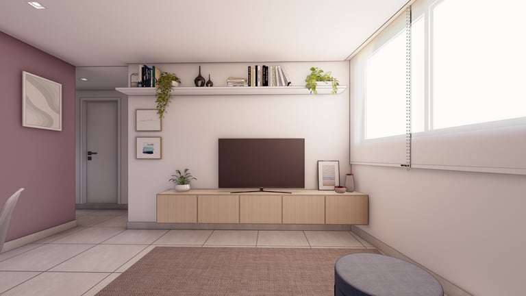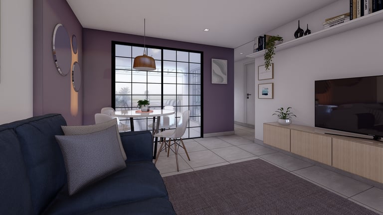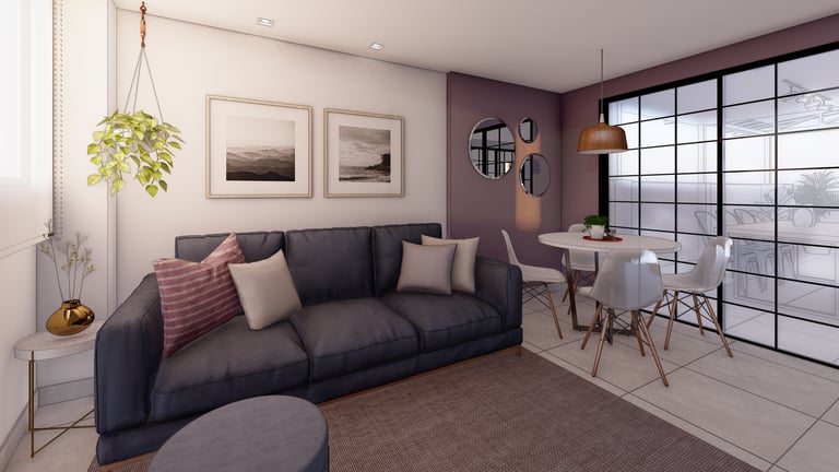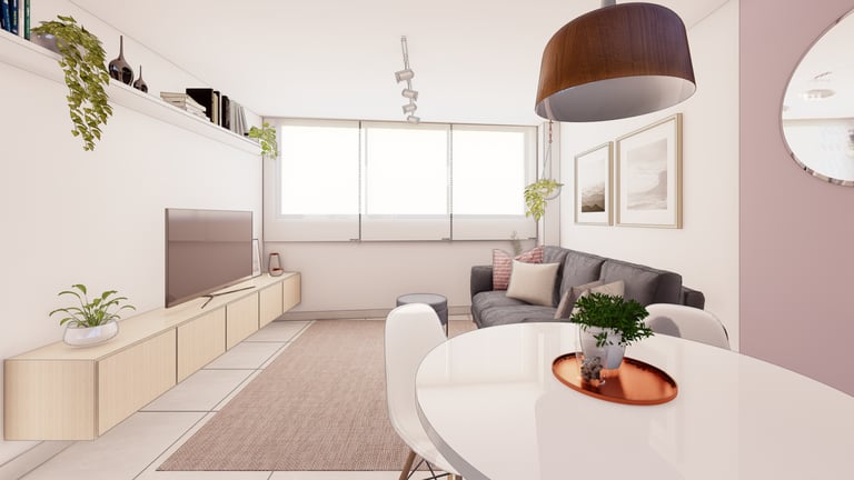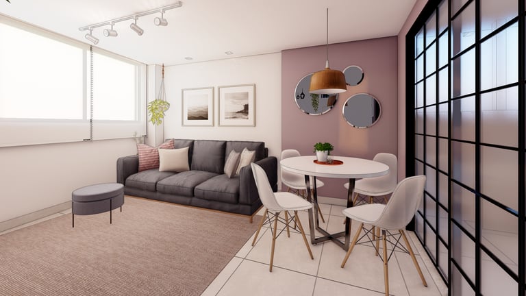 Para o espaço social, criamos um novo cômodo de sala de estar e jantar integradas. Apesar de ser uma área pequena, conseguimos possibilitar um ambiente com sensação de amplitude e fluidez, devido à otimização do layout.