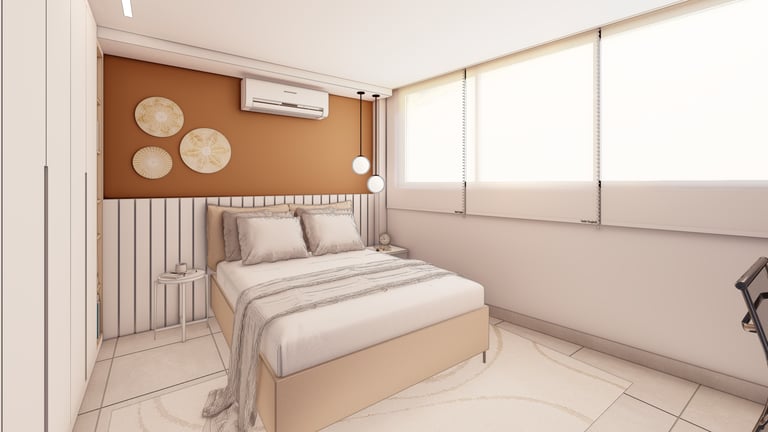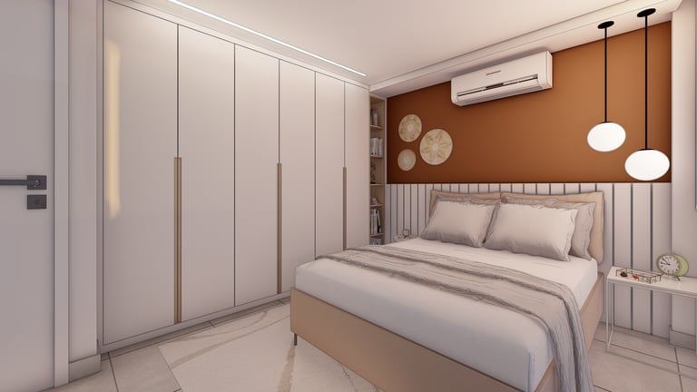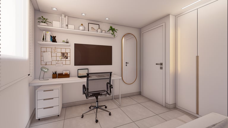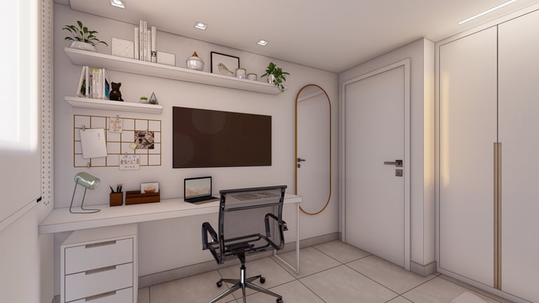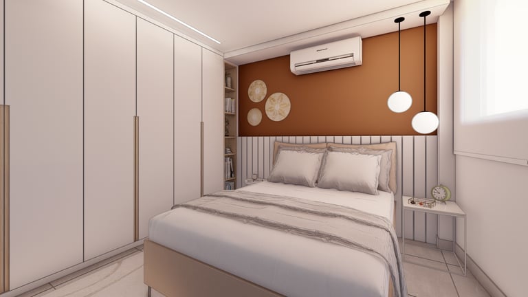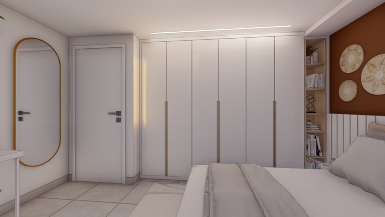 Para finalizar, o quarto possui cor pontual na parede de cabeceira, um amplo armário com nichos para livros e escrivaninha para estudos.