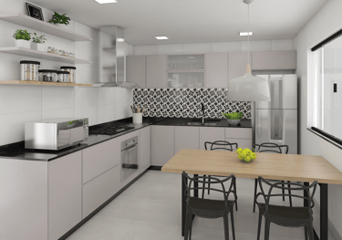 Nesa casa, revisamos o layout, realizamos a especificação de todos os revestimentos, desenhos de bancadas e marcenaria.