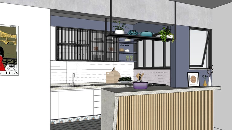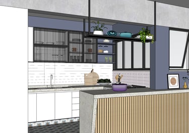 Criamos uma nova área de churrasqueira, área de serviço, cozinha e desenho de marcenaria. Soluções simples para um dia-a-dia funcional