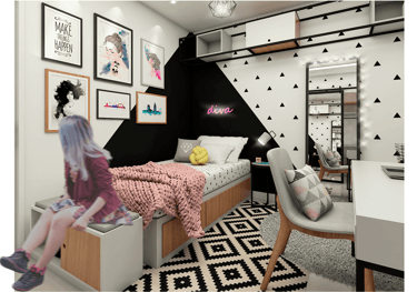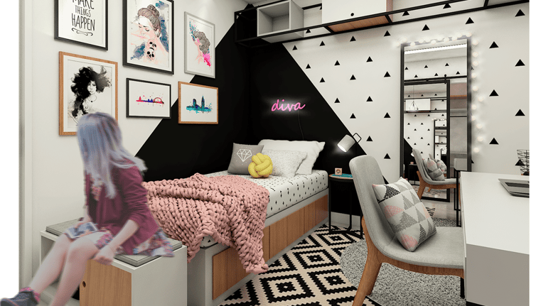 Projeto de interiores para uma adolescente muito descolada. Bia nos pediu um quarto em que pudesse tirar muitas fotos e selfies.