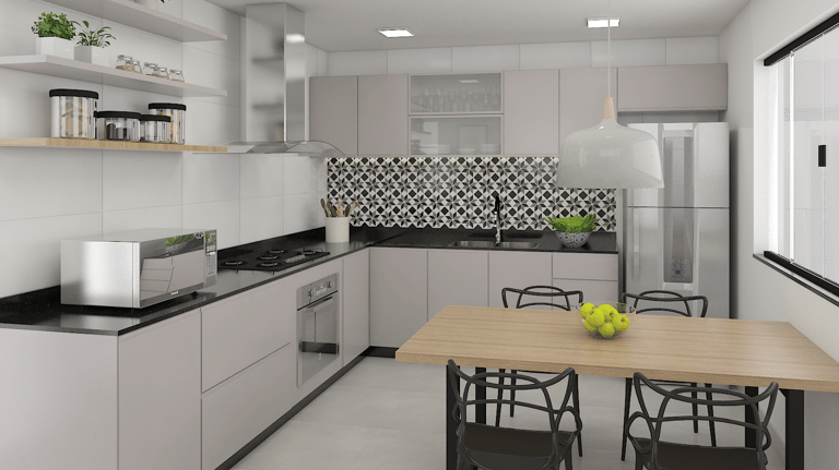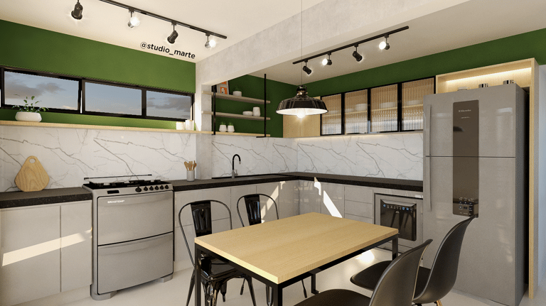 Para proporcionar um layout funcional e atender as demandas da família, projetamos a cozinha com ilha e torre quente para eletrodomésticos.