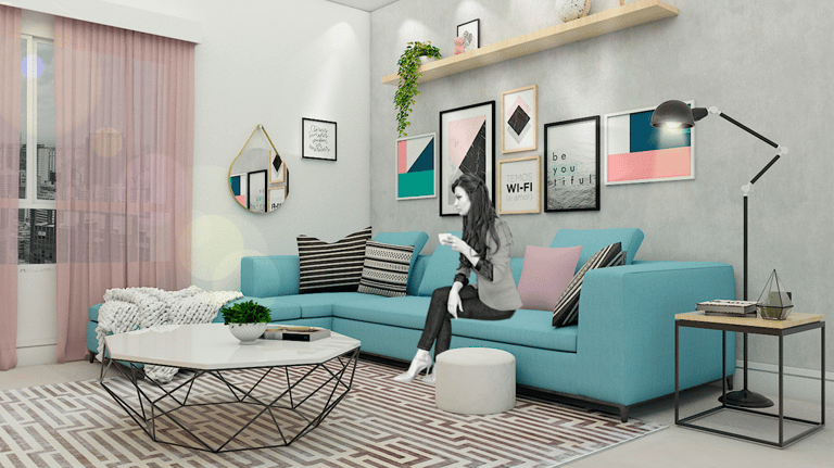 No apê Violetas, buscamos proporcionar a sensação de amplitude e leveza, optamos por uma sala clean e uso pontual das cores.